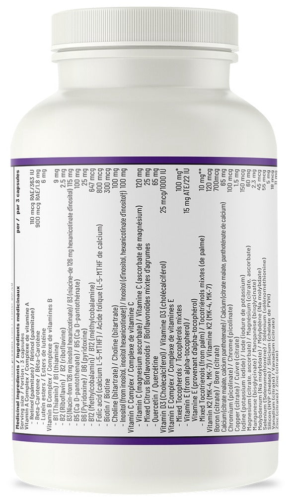 AOR - Multi Basics 3 - 90 Capsule(s) - NPN: 80025569 -- Multi Basics 3® provides optimal doses and balanced ratios of all the recognized essential vitamins and minerals in high quality forms supported by research, all in just three capsules a day.A balanced and well-designed multivitamin is fundamental to any supplement regimen. Multivitamin and mineral formulations are an excellent way to meet your daily nutrition requirements of all essential nutrients, providing a foundation on which to build your path to good health. While some nutrients like vitamins A and E are better absorbed and more effective in their natural forms, others are better absorbed in synthetic supplement form, such as folate and other B-vitamins. Some nutrients like zinc and copper must be delivered in balanced ratios so as not to disrupt certain bodily functions. Too much of some nutrients like vitamin B2 can actually inhibit absorption of other nutrients, while too little is just ineffective. Multi Basics 3® takes all of these factors into consideration, creating a carefully formulated, balanced and effective multivitamin that delivers many more benefits than a typical one-a-day multivitamin.AOR AdvantageAORs Multi Basics 3® is formulated to deliver the most fundamental nutrients in active forms in the fewest capsules possible. Multi Basics 3® includes all recognized essential nutrients and delivers them in superior forms, such as the inclusion of the complete E complex and the menatetrenone form of vitamin K.