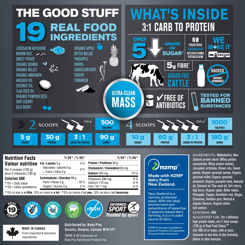 PROGRESSIVE - SPORT Real Gainer - 2.27 Grams - NPN: 00000000 -- AS A HARD GAINER OR HIGH-INTENSITY ATHLETE, YOU NEED A HIGH DOSE OF CALORIES TO RECOVER, GROW, AND/OR MAINTAIN YOUR SIZE AND STRENGTH.Why? The body is quick to break down and waste away your hard-earned muscle when its functioning at a deficit. The best plan of action? A Gainer. BUT Not all gainers are created equally. Sure - they all load you up on calories, but quick and dirty calories are usually the norm. While junk calories may pack on pounds, they arent so great when it comes to your health and getting quality gains. Think of it this way you could get big eating just donuts. But, itll compromise your health and performance, leaving you weak, tired, and unmotivated. Until now, all gainers have followed the same philosophy: quick & dirty calories to add pounds on the scale with no added health benefits.Progressive Sport Real Food Gainer is the right way to gain mass and feed your hungry body, without compromising nutrition. It features authentic New Zealand whey proteins, complex carbs, whole grains, fruit concentrates, plant oils and more!30g of CERTIFIED New Zealand Protein to build and maintain your muscle. New Zealand protein comes from the cleanest source in the world with no antibiotics, growth regulating steroids, or milk inducing hormones (including Rbgh)90g of clean carbs to restore glycogen stores post-workout and keep your body fully fueled19 REAL food ingredients, including sweet potato, quinoa, avocado and tart cherry to feed and fuel your body with good, clean nutritionOnly 5g of sugar so you dont get a sugar spike that leaves you feeling weakNo artificial flavours, colours or sweeteners
