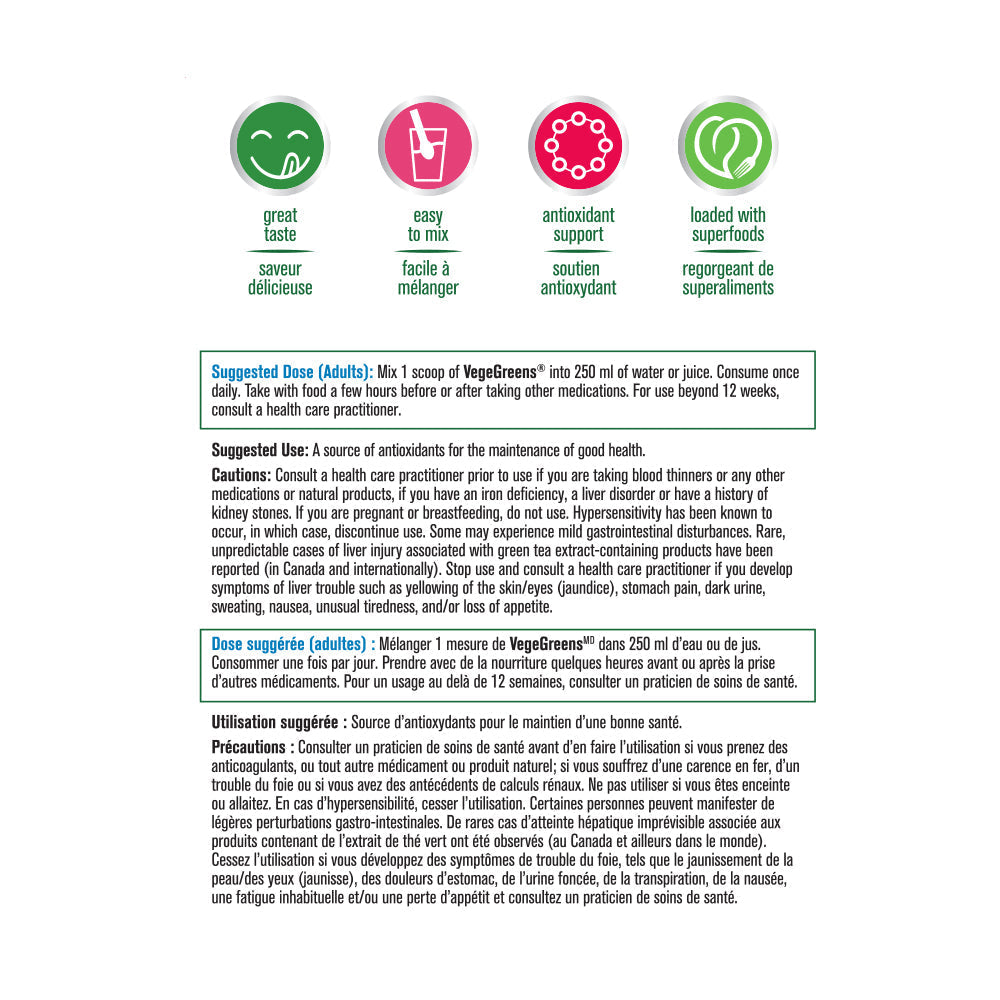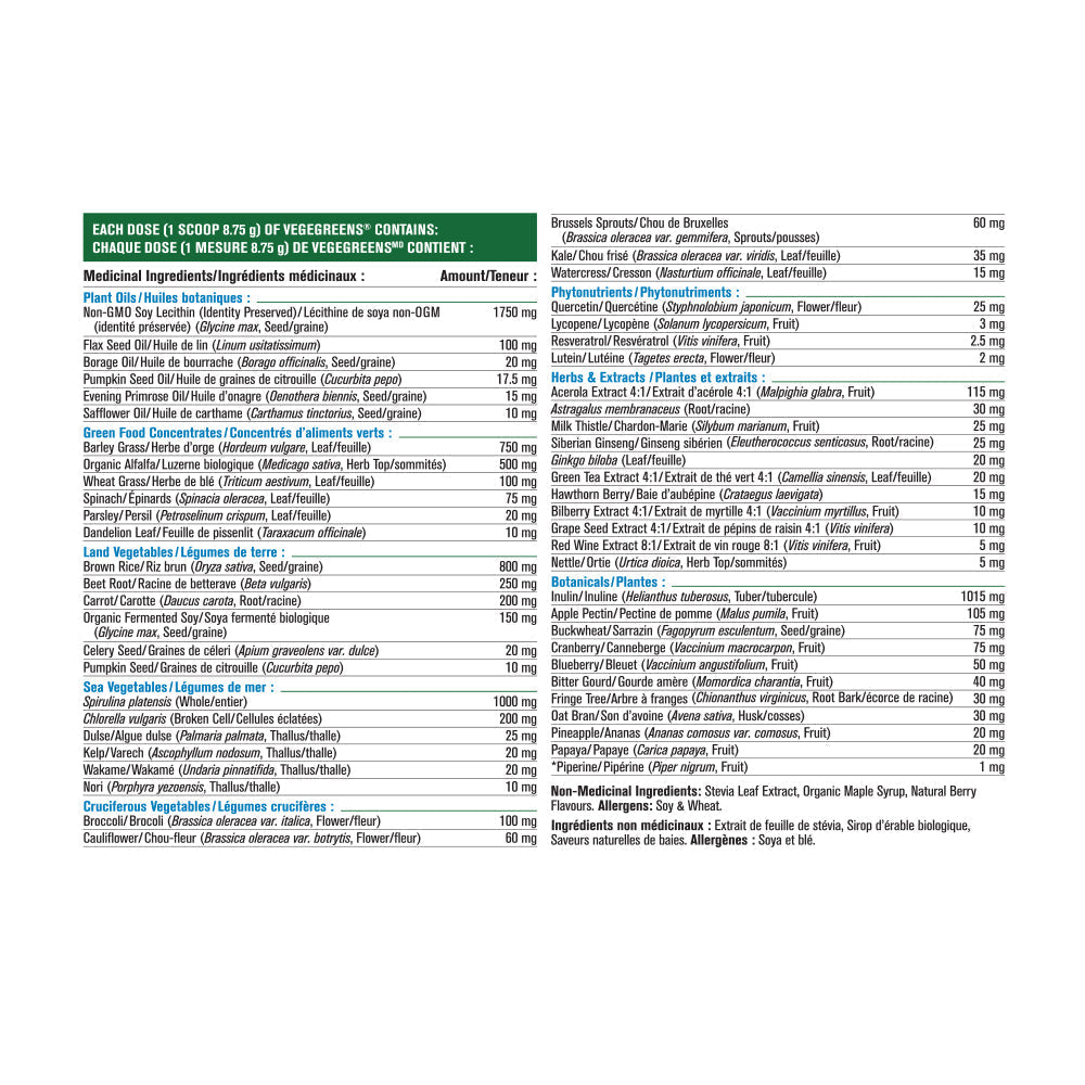 PROGRESSIVE - VegeGreens - 530 Gram(s) - NPN: 80034973 -- The Ultimate Super Food - VegeGreens is a comprehensive combination of over 60 land, sea and cruciferous vegetables, as well as super green foods, plant oils, phytonutrients, herbs & extracts and botanicals. With 8 distinctive blends of green foods and plant extracts, VegeGreens supplies an extraordinary spectrum of nutrients ranging from the rare trace minerals found in sea vegetables to the health-enhancing compounds exclusive to cruciferous vegetables. Each small scoop provides the nutrient equivalent of 6 to 8 servings of fresh vegetables