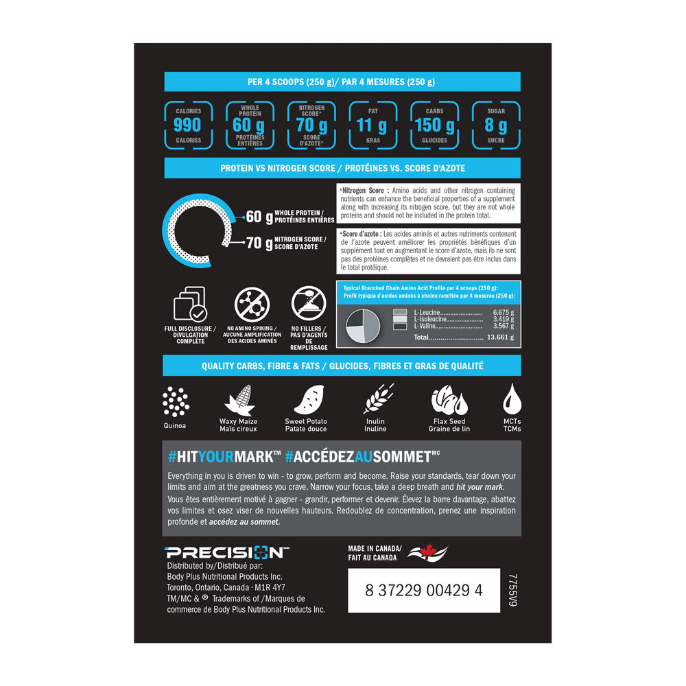 Precision - BIG TIME Weight Gain - 2.72 Kilo Gram(s) - NPN: 80057211 -- When we say BIG TIME contains 60g of protein, we really mean 60g of protein. Absolutely no amino-acid spiking or cheap fillers to give you a false number. Whole protein is what your body needs to get the full 9 essential amino acids for muscle repair after a hard days work in the gym.Amateurs eat anything and everything to gain weight. But youre an elite athlete - you know better. A high-calorie + clean-calorie supp is what you want. BIG TIME gives you exactly that: quality & quantity. Think 900+ calories from real food sources like quinoa, sweet potato, and inulin. Sugar its bad for your gut and body. BIG TIME contains only 9g of sugar per 4 scoops. But, less sugar doesnt have to equal boring taste. With 3 decadent flavours (Triple Chocolate Sundae, Vanilla Frosting, Cookies & Cream), you can enjoy amazing taste without the insulin spike.